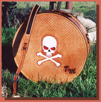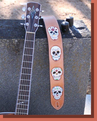 This guitar strap is a newer style, with no buckle. It is shown with a Mexican "Day of the Dead " motif. The skulls were hand carved and then painted, and the musician's name was carved on the side of the strap facing away from the camera. The end of the strap has a thinner adjustable strap to attach to the rear knob of the guitar. Lined with garment leather, this is a quality strap that says "Art". The strap is custom fit and can be ordered plain for $100, or decorated with logos or your favorite "ink". Our musicians have had it on Fender, Squire Stratocasters, Gibson, and Epiphone Les Paul Models, Taylor Big Baby Series Accoustic guitars, and Epiphone Accoustic twelve string guitars.