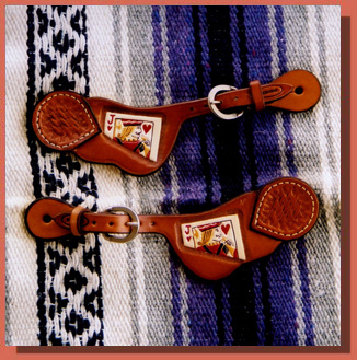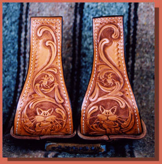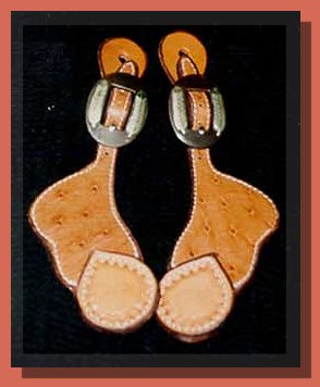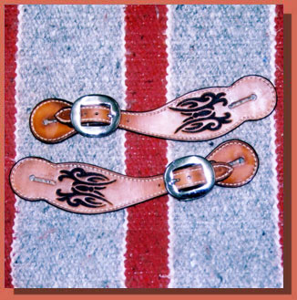 Spur straps with hand carved "Tribal" butterflies. All of our work is drawn on the leather and then carved and tooled by hand . Please do not confuse this with laser "tooling" that is done in factories.